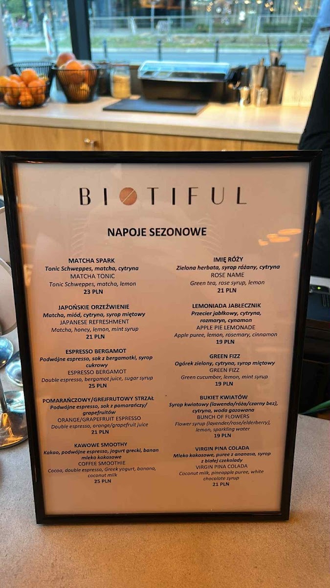 Tea lovers aren’t left out either; Biotiful offers a selection of teas, each priced at PLN 13.00. Whether you prefer black, green, or herbal, there’s a soothing tea waiting for you here. If you’re up for an experience, their Matcha Latte (PLN 17.00) invites you to enjoy a rich, frothy delight that marries tradition with a modern twist.